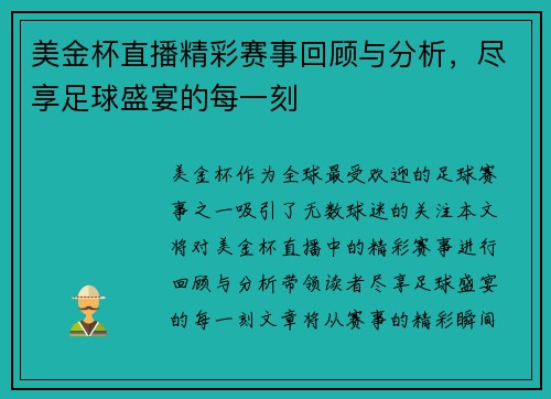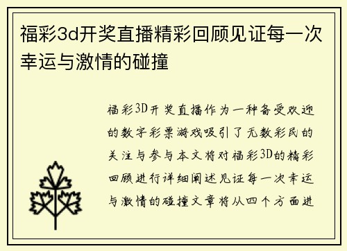 在直播3精彩赛事回顾中,我们见证了运动员们的拼搏与荣耀。这些赛事不仅展现了运动员们的卓越技能和不屈精神,也让观众感受到体育的魅力与激情。本文将从四个方面详细回顾这场盛会,包括赛事的精彩瞬间、运动员的奋斗历程、观众的热情支持以及赛事的影响力。通过这些方面的阐述,我们将更深入地理解体育赛事背后的故事和意义。 1、赛事的精彩瞬间 在直播3的赛事中,许多精彩瞬间令人难以忘怀。每一场比赛都充满了悬念和激情...